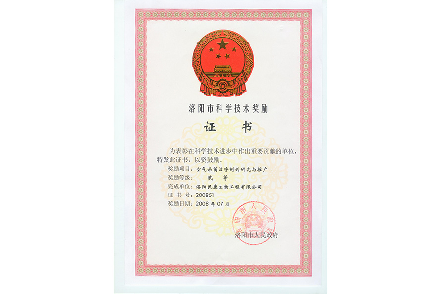 洛陽市科學技術獎勵證書